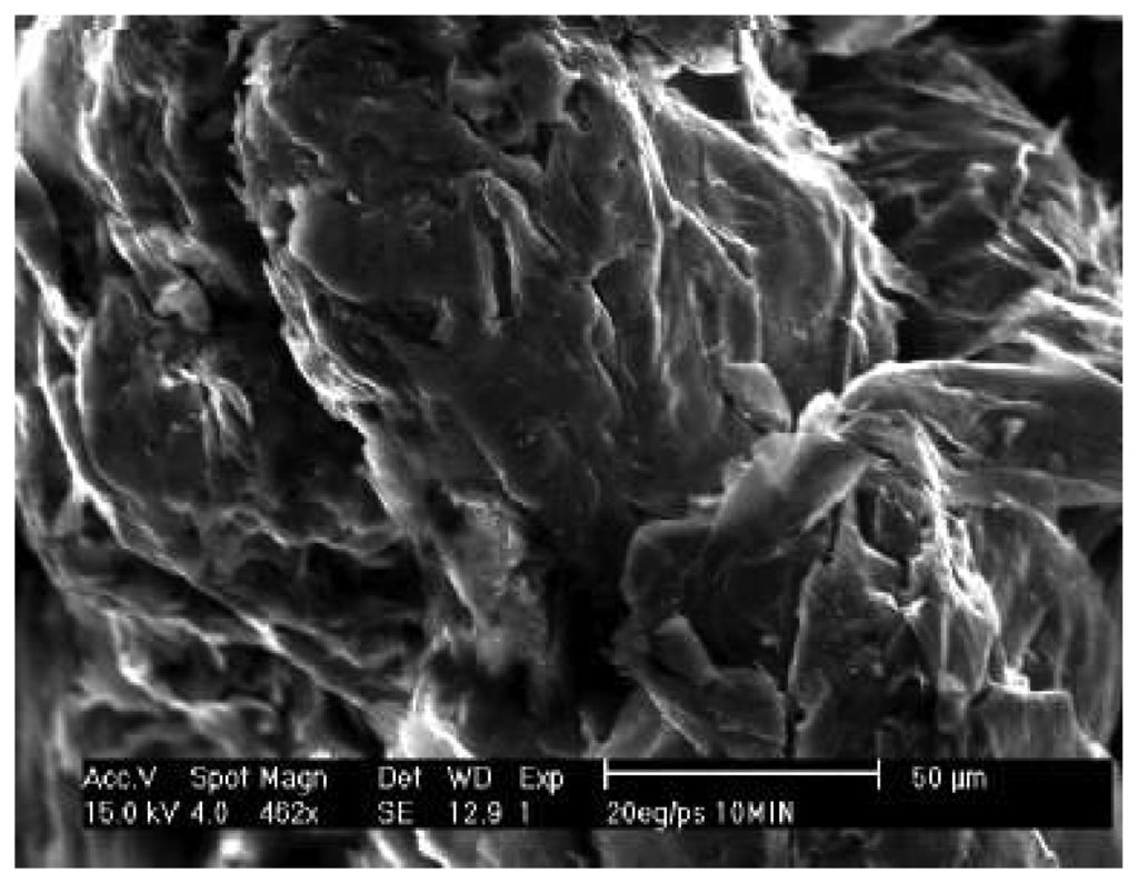 SEM imaging has been used to provide qualitative information about structure, e.g., size and distribution of exfoliated graphite zones and some surface features of this composite electrode. Fig. 1 illustrates SEM image of the cross-section of EG-PS composite electrode and exhibits a closely spaced exfoliated graphite zones with random distribution and orientation due to the irregular shapes of exfoliated graphite particles in polystyrene matrix [, ].