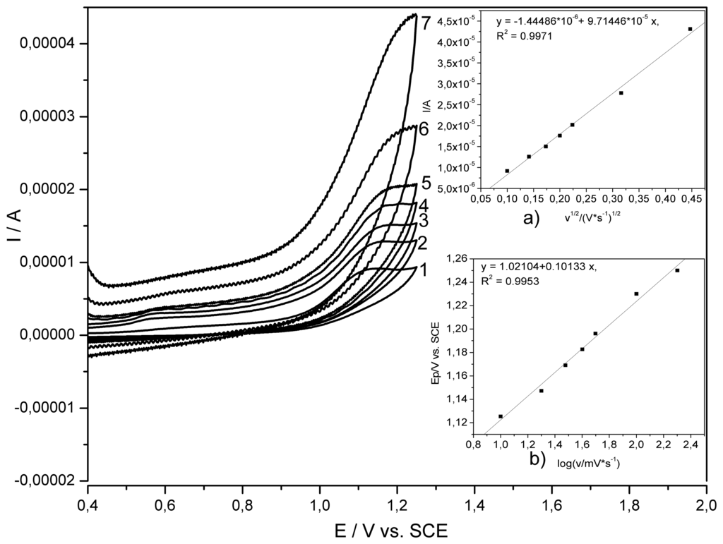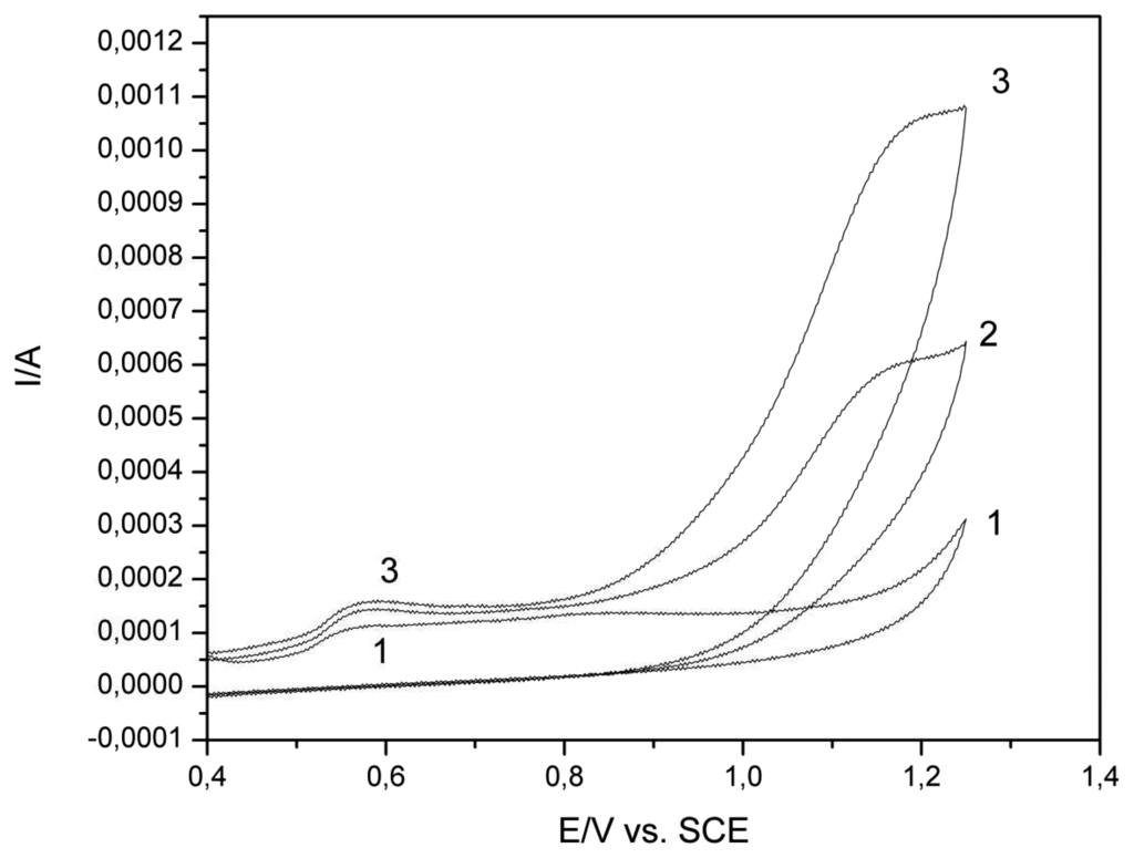 In Fig. 5, linear scan voltammograms obtained under the same CV conditions are shown. The dependences of the current peaks vs. concentration, explored in the concentration range between 0.1 mM-1 mM, were linear, with the very good correlation coefficients, 0.998. The shapes of CVs at 0.6 V were conditioned by the previous successive scan in the extended potential range (cathodic branches at less positive potential are omitted in the above-presented figures).