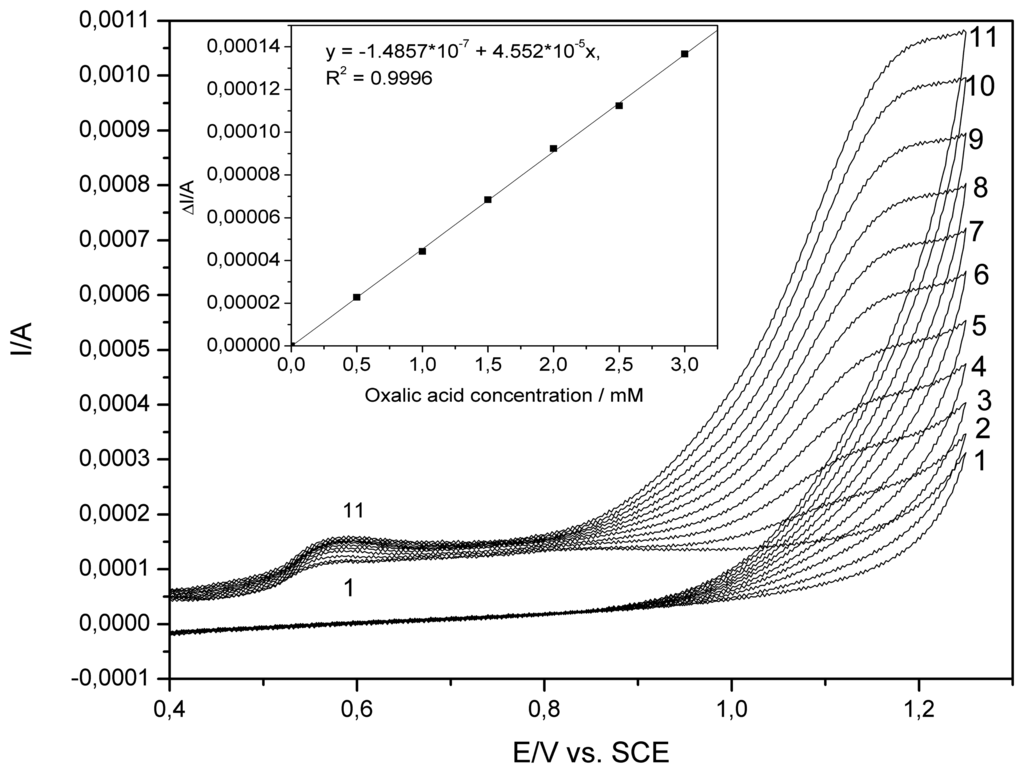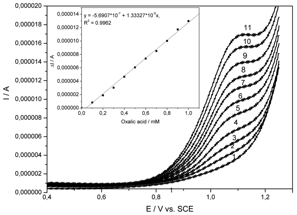 The anodic limiting current recorded at 1.15 V vs. SCE increases with increasing of oxalic acid in solution (Fig. 4). The inset of Fig. 4 shows that the anodic limiting current depends linearly on the oxalic acid concentration in the range 0.1-1.0 mM, with a correlation coefficient better that 0.999.