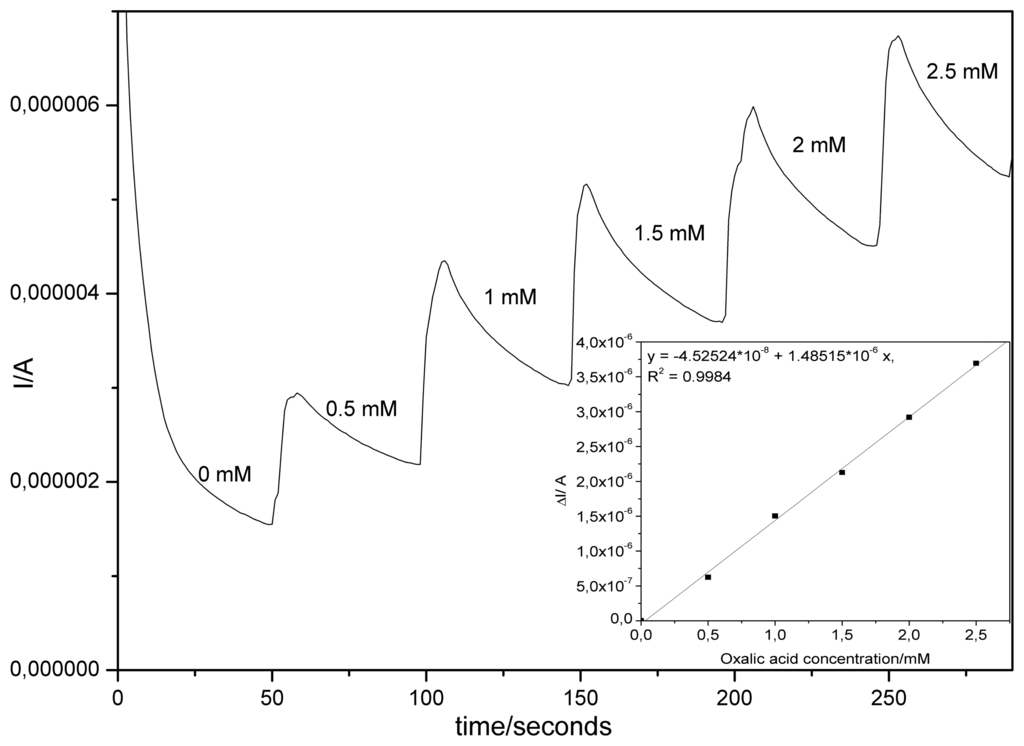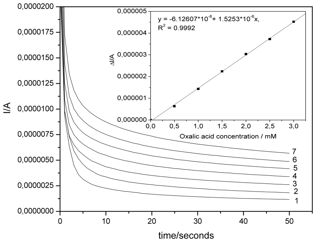 Chronoamperometry was employed as the detection method and for the investigation of the electrode process as well. Fig. 6 shows chronoamperometric measurements of oxalic acid with EG-PS. This figure presents the current-time profiles obtained by setting the working electrode at 1.1 V vs. SCE for various concentrations of oxalic acid. The useful net current signals recorded at 50 seconds are linearly dependent on oxalic acid concentration in the explored concentration range between 0.5 mM and 3 mM (Inset of Fig. 6).