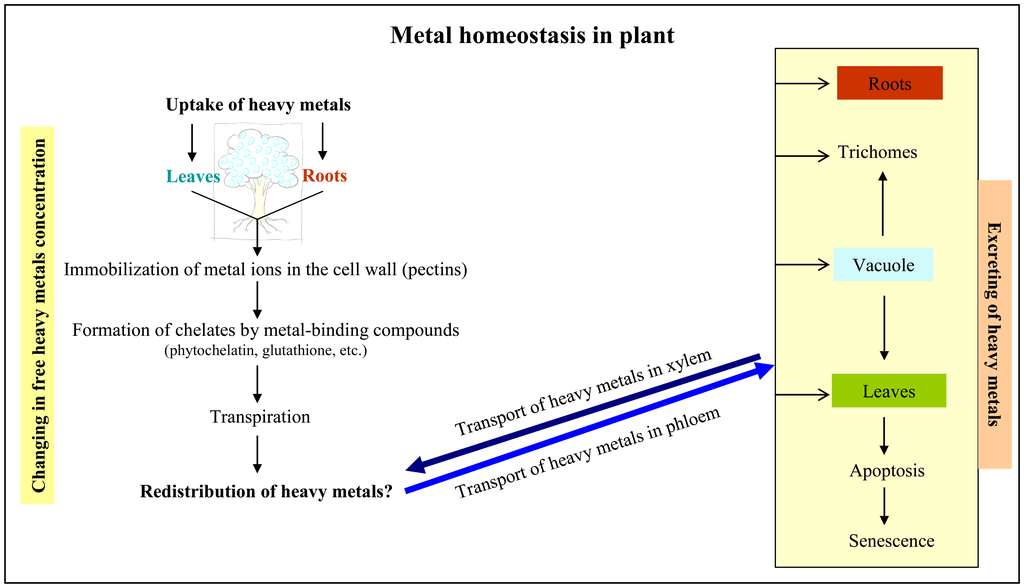Besides microorganisms and certain animal species, plants are the main group of organism affected by heavy metals in the soil. Plants have different strategies for uptake, distribution or redistribution of elements, which allow them to maintain stability of the inner environment (homeostasis). It is known that plants increase solubility and mobility of elements such as iron due to easier and better uptake of them, which could proceed via roots and/or leaves (Fig. 1).
