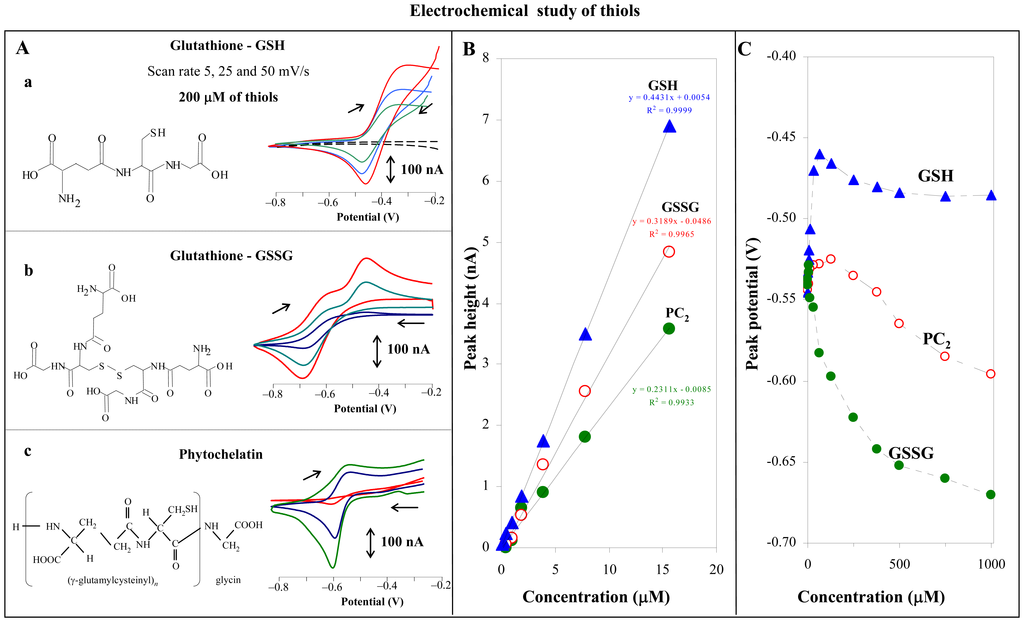 Electrochemical behaviour of reduced (GSH) and oxidized glutathione (GSSG) and phytochelatin2 (PC2). (A; a,b,c) Chemical formulas of GSH, GSSG and PC2, and their typical cyclic voltammograms. Thiol concentration 200 μM and scan rates (5, 25 and 50 mV/s). Dependence of (B) height and (C) potential of thiols signals on concentration (0 – 20 μM). Scan rates: 20 mV/s. Supporting electrolyte (0.05 M Na2B4O7, pH 9.2). CV parameters were as follows: step potential 5 mV, start potential −0.2 V, vertex potential −0.8 V, deoxygenating by argon for 140 s.