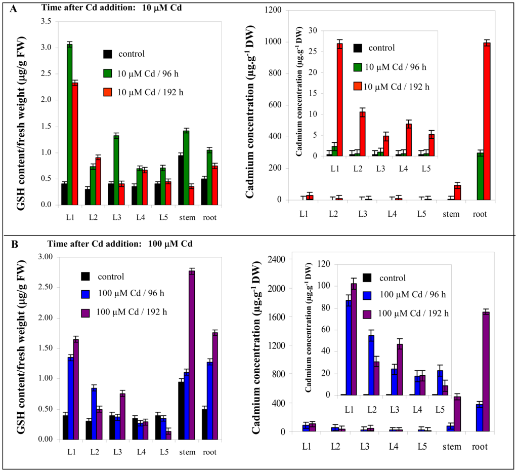 In plants exposed to cadmium dosage 100 μM, on the other hand, amounts of GSH increased continuously till the end of the experiment. The highest GSH contents were detected in stem, root and leaf L1. Again the tendency to a decrease in GSH content is evident in younger leaves (Fig. 11B). Number of authors has also observed changes in glutathione content during exposition by different stress factors [112,117,118]. On the other hand, a recent study of the regulation of phytochelatin synthesis in marine green alga has been published, where the authors have shown that glutathione content was constant [119].