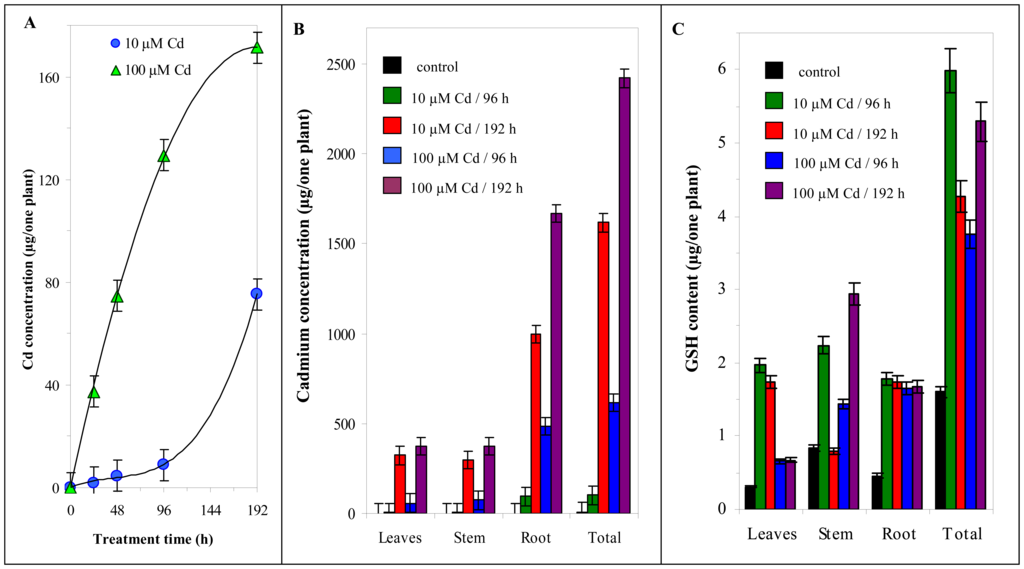 We obtained surprising results for the total concentrations of Cd and GSH in a whole plant (Fig. 12). Concentration of Cd in one plant according to treatment time is shown in Fig. 12A. Cadmium concentration in plants treated by 100 μM Cd increased almost linearly according to treatment time. On the other hand, Cd concentration in plants cultivated in nutrient solution containing 10 μM Cd markedly increased after 96 h of exposition. In addition, we determined cadmium concentrations in individual parts of maize plants (Fig. 12B). Finally we showed GSH content per a plant (Fig. 12C), because we attempted to observe the heavy metal stress response in whole organism exposed to the heavy metal. GSH content in roots did not change according to time of exposition and Cd concentration (Fig. 12C). This trend could suggest that protection mechanisms in roots are triggered by very low concentrations of a heavy metal. The maximal concentration of GSH was determined in the leaves of plants exposed to a lower cadmium dosage (10 μM Cd). The higher Cd dosage caused significant depression of GSH concentration that is probably related to phytochelatin synthesis [44,101,112].