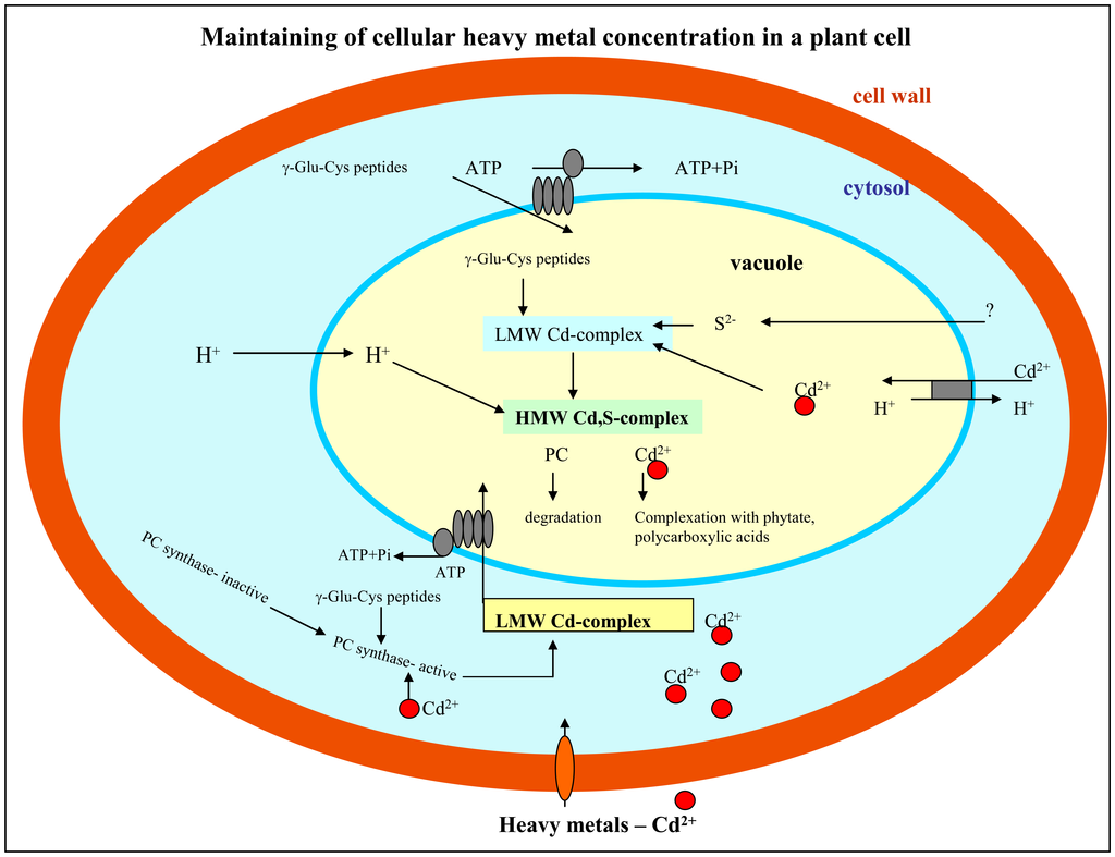 The scheme of cadmium detoxification by phytochelatins in a plant cell. Cadmium ions are transported through proton pump into the vacuole. Here, cadmium ions activate phytochelatin synthase, which form with the metals ions the M-PC complex (LMW Cd). This complex is consequently transported through tonoplast to vacuole (ATP consumption). Here, low molecular complex is transformed to high molecular weight M-PC complex (HMW M-PC) via –S–S– groups [17,18].
