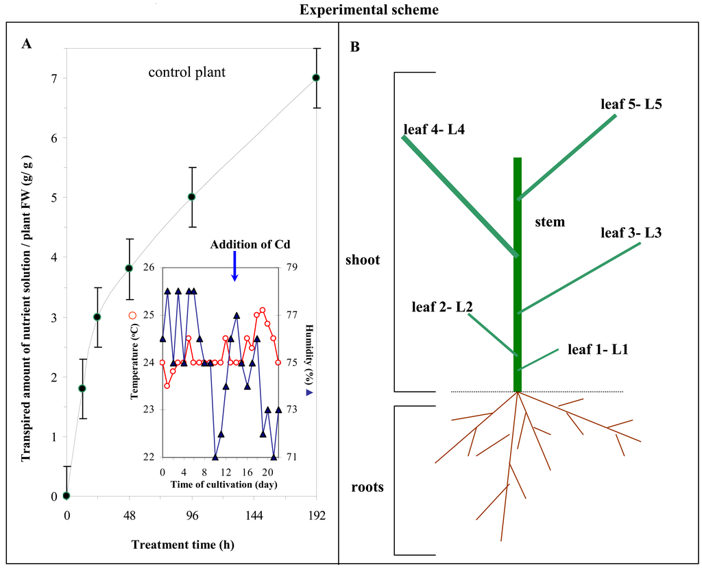 Experimental scheme of maize plant used for cadmium and thiols determination (A). Total transpiration of control plants; transpiration was calculated according the procedure given in Material and methods. In inset: dependence of temperature and humidity during maize cultivation in greenhouse (0 – 22 days); the arrow indicates cadmium addition (B).