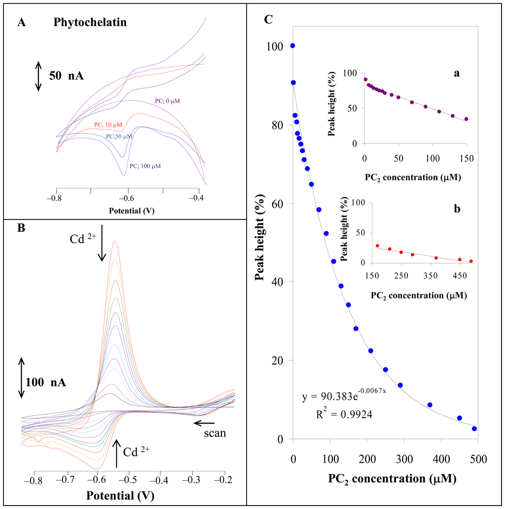 Interaction of phytochelatin with cadmium measured with Autolab Analyser. (A) Cyclic voltammograms of phytochelatin (10, 50 and 100 μM). (B) Influence of phytochelatin additions (0 – 500 μM) on cadmium signals (150 μM). Arrows indicate changes of cadmium signals with increasing phytochelatin concentration. (C) Dependence of decrease of cadmium signal (150 μM of cadmium(II) ions) on phytochelatin additions (0 – 500 μM), changes within the range of (a) 0 – 150 μM and (b) 150 -500 μM. Peak height of 100% corresponds to 717 nA. CV parameters were as follows: the initial potential of –0.2 V, the end potential –0.8 V and step potential 5 mV.