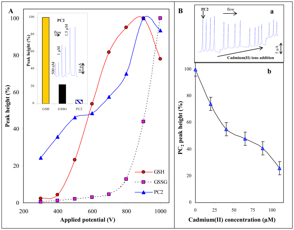 To our knowledge, free –SH moieties in PC2 molecule not only have the highest affinity to heavy metals but also show the highest electroactivity. PC2 signal decreased markedly with increasing cadmium(II) concentration up to 40 μM. This sudden decrease is probably associated with binding of cadmium(II) into all free –SH moieties of phytochelatins (Fig. 6Bb). In addition, the PC2 signal decreased with cadmium(II) dose higher than 50 μM more gradually, which can be associated with interactions of cadmium(II) ions with other free moieties in PC2 molecule (e.g. –NH).