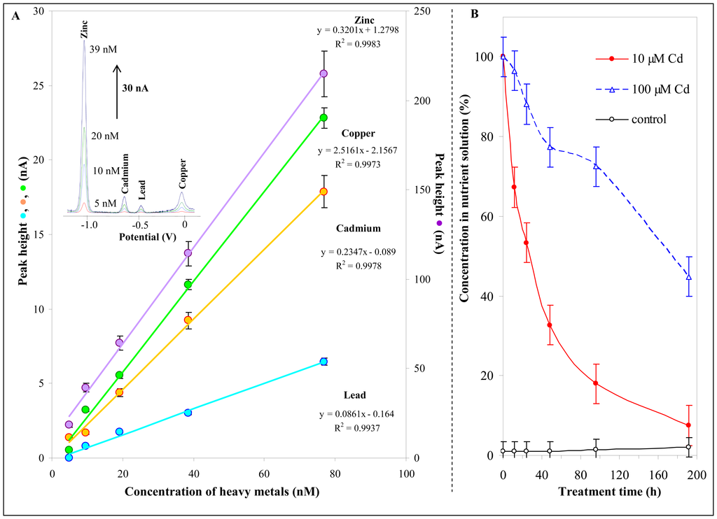 Primarily we focused on determination of cadmium concentration changes in nutrient solution during 196 h long experiment. These changes could be used to evaluate the plant's ability to uptake Cd from the nutrient solution. Electrochemical determination of cadmium in nutrient solution was accomplished by differential pulse anodic stripping voltammetry (DPASV). The typical voltammograms of simultaneous determination of zinc(II), cadmium(II), lead(II) and cupper(II) (5, 10, 20 and 39 nM; are shown in inset in Fig. 8A. The calibration curves in acetate buffer (Fig. 8A) is strictly linear with R2 = 0.99. The detection limits for the heavy metals as 3 S/N were evaluated as units and tens of pM. This very sensitive detection method was used due to precise detection of very small cadmium concentration changes in nutrient solution.