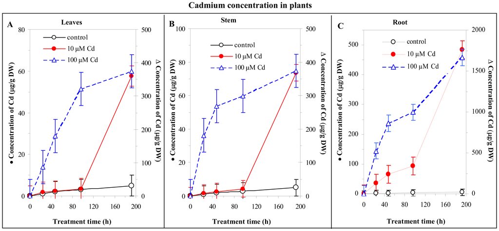 Dependences of cadmium contents in leaves (A), stem (B), and root (C) on cadmium treatment time.