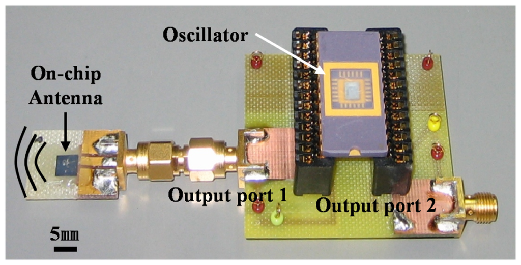The CMOS VCOs and integrated antennas were fabricated by the same CMOS technology on each silicon wafer. The fabricated CMOS VCOs and integrated antennas were packaged with the SMA connector for electrical connection. Before the impedance matching procedure, the output power of the CMOS VCO for 50Ω load was −0.93 dBm (=810 μW).