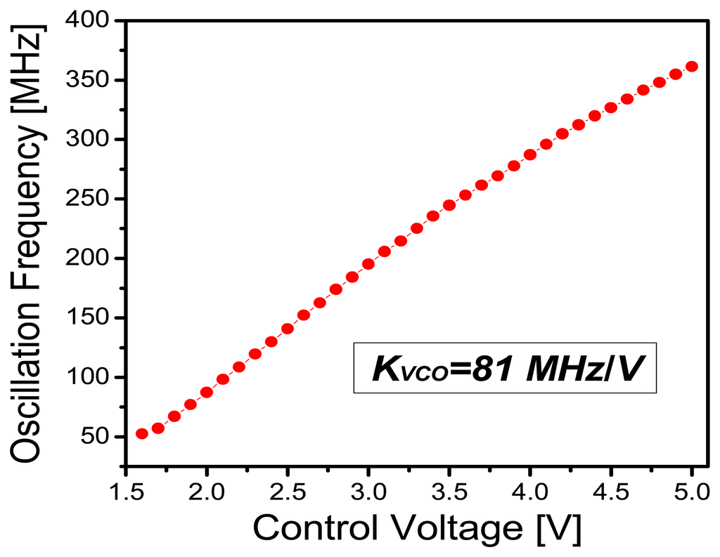 Measured relationship between oscillation frequency and control voltage of fabricated VCO. The KVCO is extracted from this measured relationship.