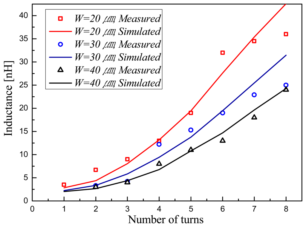 When the number of sides grows (square to circular geometry) the inductance grows faster than the resistance. It can be set as a design rule that an optimum inductor has to be designed with the highest number of sides allowed by the fabrication technology [10]. On the other hand, if the spacing is reduced, the quality to augment because the resistance is maintained and the inductance is increased be set as a design rule that to maximize the quality of an inductor has to be designed with smallest spacing allowed by the technology. The external radius and number of turns have been analyzed. They define the inductor's length. Figure 6 shows the influence of the number of turns comparing the measured results with simulated results. As the number of turns increases the inductance grows and the quality curve shifts to lower frequencies. However, an empirical analysis to set the design rule for the external radius and the number of turns is necessary. Figure 6 shows also the influence of the track widths. The track widths increase the inductance to diminution because more metal track length would be needed leading probably to higher DC resistance and coupling to the substrate [11].