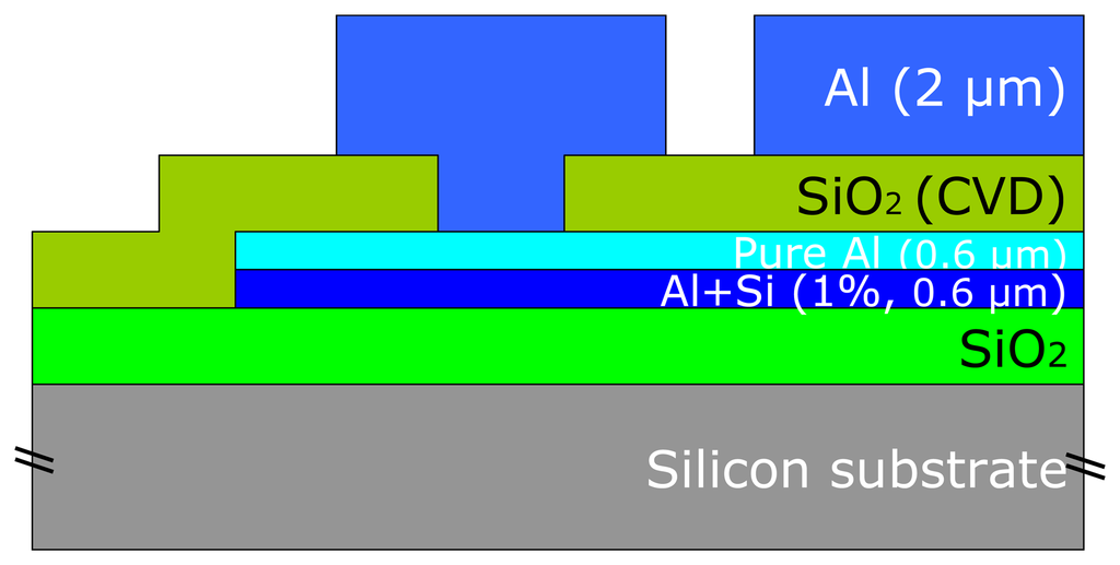 Cross section of the spiral inductors with two metal layers in CMOS process.