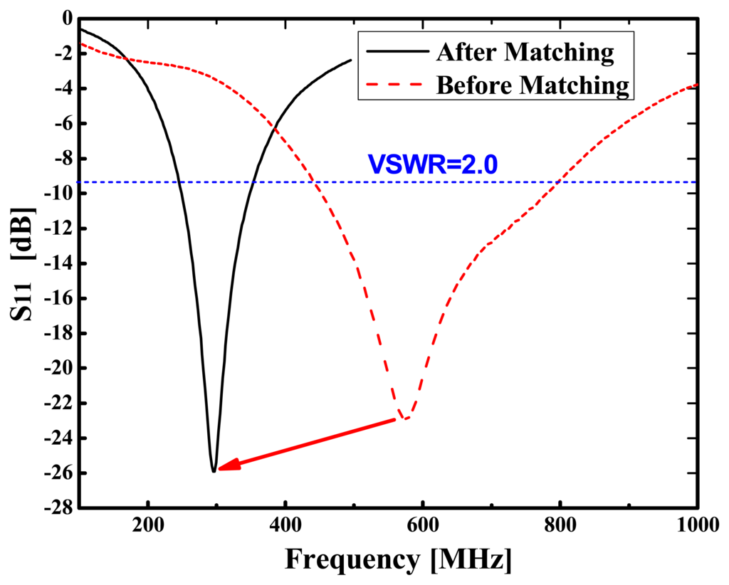 The output impedance of CMOS VCO has been well matched to 50Ω by inserting a passive matching element (series L, 27 nH). After the matching, the output power of the CMOS VCO became 1.09 dBm (=1.28 mW) at the same supply power. The power efficiency has become 50 % higher as compared to that before the matching. Although the matching was performed by a discrete component in this experiment, it is possible to be integrated on the same chip by extracting the proper value of the parameter from the experiment. Figure 9 shows the measured return loss characteristics before and after the impedance matching of the on-chip antenna fabricated on silicon. The center frequency was moved from 600-MHz to 300-MHz as a result of impedance matching. Also, the voltage standing wave ratio (VSWR) is improved by the matching procedure. The measured bandwidth with a VSWR better than 2.0 was approximately 247-to 351-MHz. This corresponds to the measured result of Figure 9.