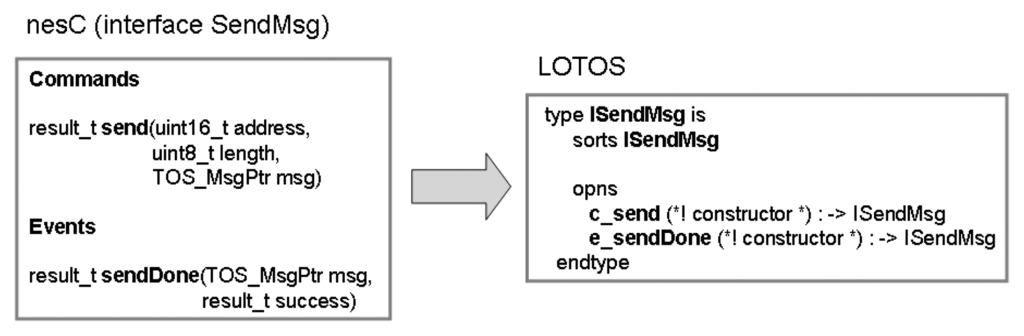 As mentioned in Section 2.2, each nesC interface has a set of functions (commands and events). As we are only interested in the module interactions or temporal ordering of events (not in their functionality), these functions are defined as LOTOS operations of an abstract data type (ADT) defined for each interface. In this way, the nesC interface <interface-name> leads to the definition of the LOTOS ADT “I”<interface-name>. The command <command-name> and event <event-name> are defined as type operations “c_”<command-name> and “e_”<event-name>, respectively. In order to illustrate this approach, the interface SendMsg is presented in Figure 1.
