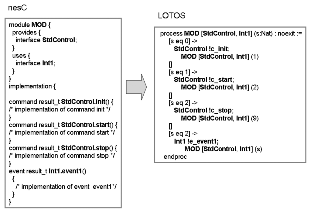 The choice of LOTOS has been based on some facts. Firstly, it is a ISO standard specially designed for describing the behaviour of concurrent systems like nesC applications. Secondly, the way LOTOS applications are structured (hierarchically) is very similar to the way the applications are organised in nesC. Finally, the expressiviness of LOTOS enables us to specify the application in many different levels of abstraction, which facilitates to treat with the complexity of nesC applications.