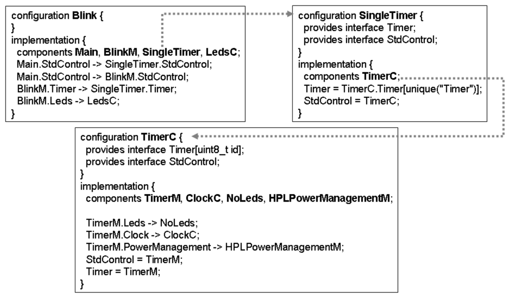 Blink is a basic application that toggles the leds on the mote on every clock interrupt. The clock interrupt is scheduled to occur every second. Figure 3 shows the configurations ( BLink, SingleTimer and TimerC) that make up the whole application. The modules can be identified in the clauses “components” within the configurations.