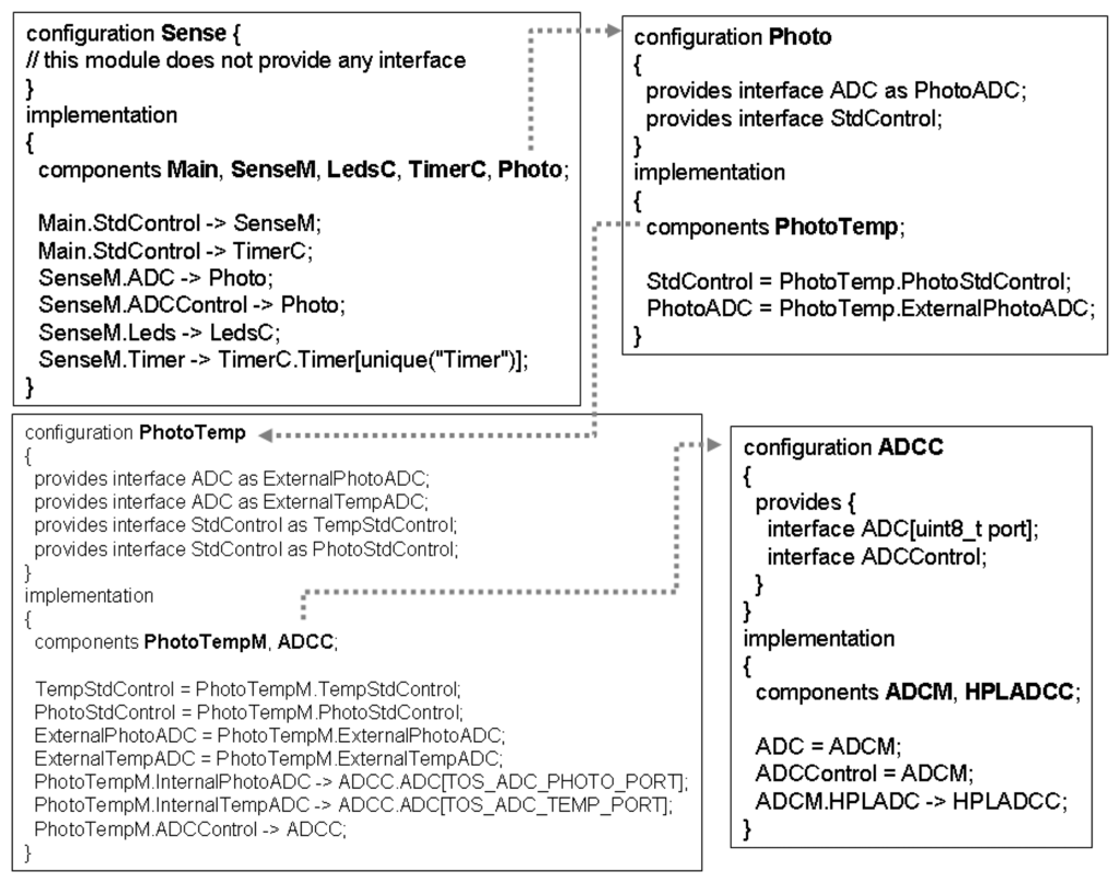 As the modules and configurations have been identified, it is necessary to defiine how they are wired. For simplicity, the specification ahead only shows the top-level specification Sense, in which we have the following connections: Main to SenseM and TimeC through StdControl (line 6); SenseM to LedsC through Leds (line 8); SenseM to TimerC through Timer (line 8); SenseM to Photo through ADC (line 8), ADCControl and StdControl (line 8). LedsC, TimerC and Photo are not connected (lines 11 and 13).