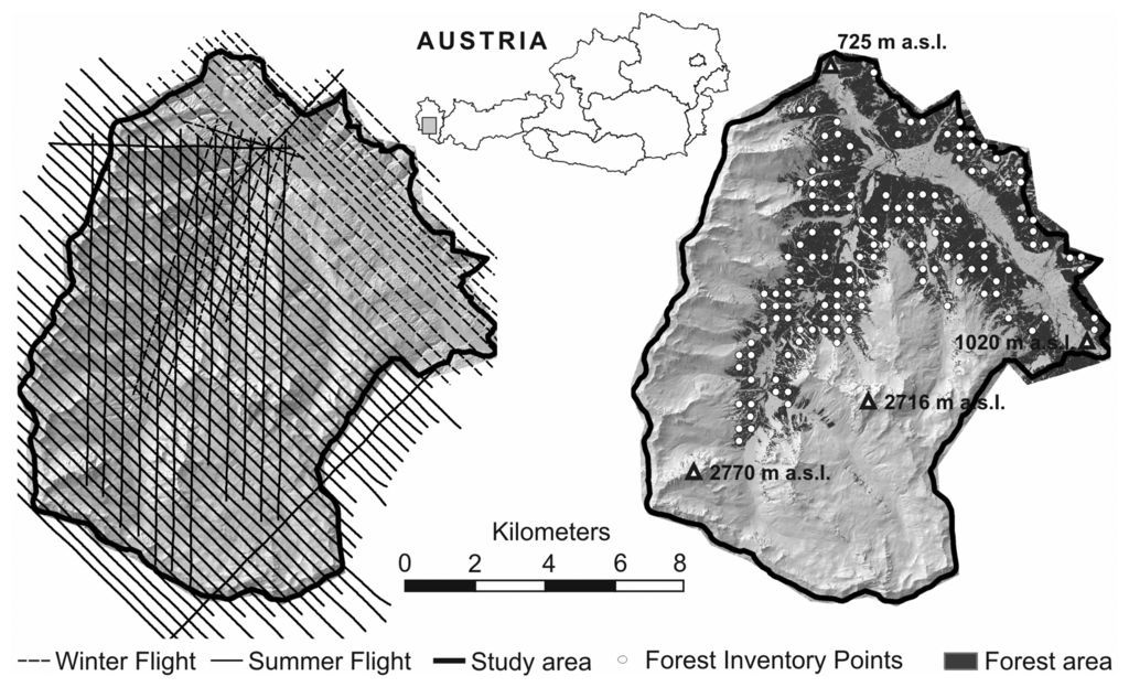 We would like to thank the Landesvermessungsamt Feldkirch for granting the use of the ALS data and the forest administration “Stand Montafon Forstfonds” for providing the forest inventory data. Furthermore, we are grateful to our colleagues C. Eberhöfer and H. Kager for the pre-processing of the ALS data. Parts of this study were funded by the Austrian Federal Ministry of Agriculture, Forestry, Environment and Water Management (BMLFUW) in the framework of the project ÖWI-Regio.
