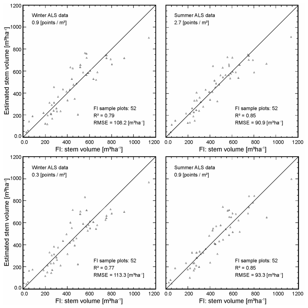 Concerning the effects of varying ALS point densities this study shows that for each ALS data set an individual model can successfully be fitted as summarized in Table 3. This is confirmed by the small differences of the derived root mean square errors for the original and the thinned winter and summer data. To guarantee that only the point density influences the results, only those sample plots were used, which are located in the overlapping area between winter and summer ALS data. Even tough the differences of the derived root mean square errors between the original and the thinned winter and summer data are small, it was observed that the increase of the RMSE (ΔRMSE = 5.1 m3ha−1) with decreasing point densities from 0.9 to 0.3 p/m2 is slightly higher than those (ΔRMSE = 2.4 m3ha−1) from 2.7 to 0.9 p/m2 (Table 3).