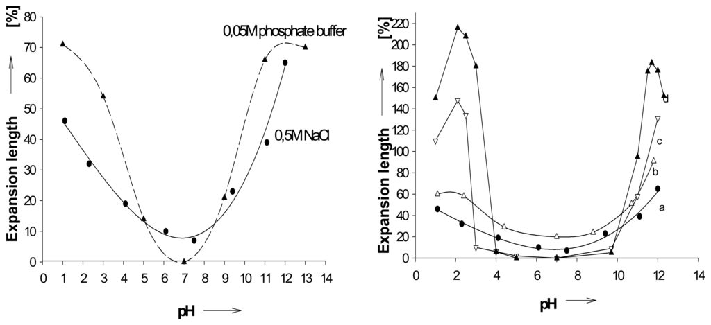 The chemomechanical response to varying pH depends strongly on the ionic strength of the medium (Figure 1b) []. Independent measurements indicate that similar expansions, for example, at pH 2 and 12 in presence of salts (Figure 1a) occur with related sodium chloride concentrations alone at neutral pH. Thus, the lower and higher pH effects are also due to increased ionic strength by the acid or base concentrations at such pH values. [] In accord with this, it was found that polysaccharide-derived gels decrease their swelling with an increase in the ionic strength of the salt solutions, due to charge screening effect for monovalent cations, as well as to ionic crosslinking for multivalent cations [].