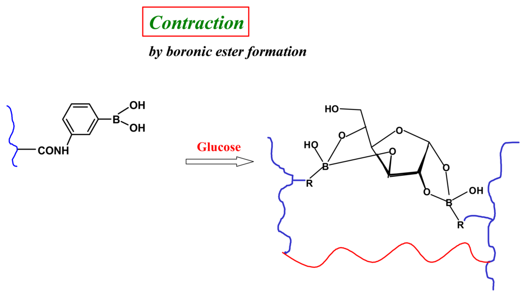 In many respects glucose is an ideal target effector in chemomechanical polymers. The extensive studies of boronic acid-glucose binding in aqueous solution [] reveal that it is (i) a strong and (pH-dependent) reversible covalent interaction (Figure 11), (ii) a very effective means to enhance negative charge accumulation on boron, thereby rendering a polymeric gel more hydrophilic and inducing significant degrees of swelling and, (iii) with appropriate stoichiometric control during synthesis, selectively condenses of with two boronic acids [], to promote macroscopic shrinkage by reversible covalent crosslinking (Figure 12) [,].