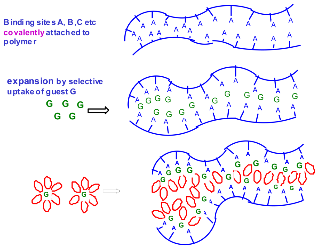 Sensors are increasingly being used for monitoring changes in environmental conditions in a fully automated manner. This includes detecting the levels of chemical compounds in living systems. In most applications, a sensing unit is only one component of an operating system which responds to the sensor signal by a predetermined action, e.g. by correcting the pH of a medium by adding neutralizing agents. A unique feature of chemomechanical polymers is that they function simultaneously as both sensors and actuators. These intelligent materials can be designed to respond to changes in external conditions via macroscopic or microscopic motions, which may then be used to control electric circuits or to open or close, e.g., vessels for the release or uptake of different agents. The major advantage in comparison to traditional control systems is that chemomechanical polymers can operate without any additional devices such as transducers or transmitters, and without any external power supply. These new materials can be fabricated in a variety of ways, down to the micro- or nano scale, or as thin films, to afford the added advantages of enhanced sensitivity and speed of response. The field is expected to expand considerably after chemists have, in the framework of supramolecular chemistry, developed the principles of molecular recognition, which, until now have been studied mainly in solution []. Smart materials, into which suitable recognition sites are incorporated, hold much promise for a manifold of applications [], including drug delivery [], detoxification, control of biological functions in the body, artificial muscles [], etc. Scheme 1 illustrates the mechanisms involved in expansion of hydrogels by the uptake of guest molecules G which bind non-covalently to acceptor sites A,B,C, etc., on the polymer backbone.