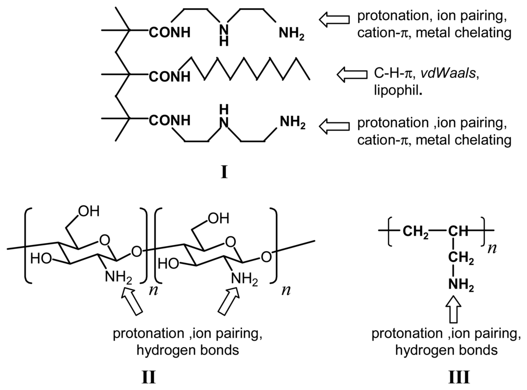 Structures of some chemomechanical polymers (I: polymethacrylic acid with supramolecular binding functions, II: chitosam, III: polyallylamine).