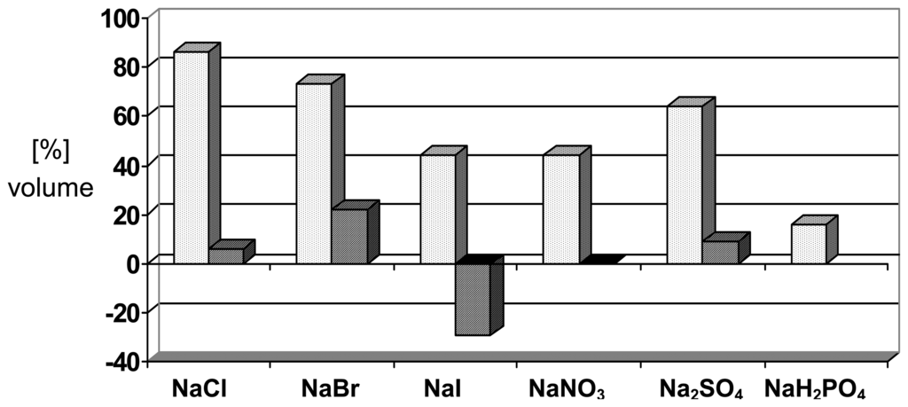 Volume changes ([%]) induced by different anions on the PMMA-derived polymer I; [NaX] = 0.10 M; left bars (always expansion): in pure water, pH 7.3; right bars (partially contraction), in presence of 0.02 M phosphate buffer, pH 7.0. Copyright Wiley-VCH Verlag GmbH & Co. .