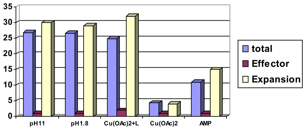 Examples for expansion (in one dimension) in ternary complexes in case of polymer I; Cu(II) and Effector 0.25 mM; pH 4.5. Net volume expansion: effect of Cu2+ alone deducted [].