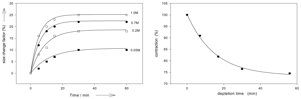 The speed of volume changes are essentially a function of the effector diffusion into the gels, as described by Fick's laws. It has been shown that expansion of xanthan-chitosan-derived gels upon pH changes seems to be mainly controlled by the diffusion of mobile ions, except that at pH values below 10 the degree of ionization during swelling also may affect the swelling rate [,]. Figure 2 illustrates that with the PMMA derived polymer I the kinetics of both expansion and the fully reversible contractions follow pseudo first–order equations, the same holds for the corresponding ab- and desorption of the effectors [].