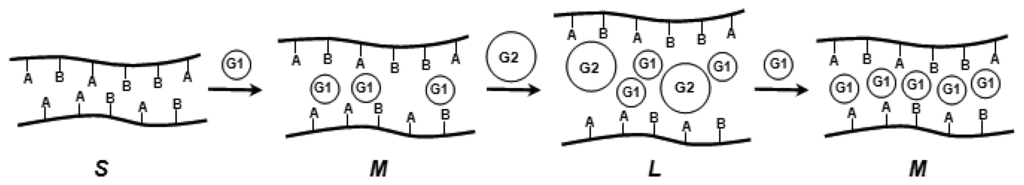 Cooperativity effects in a polymer containing two binding sites A and B with two guest molecules G1 and G2; S: small/tight; M: medium loose; L: large loose network.