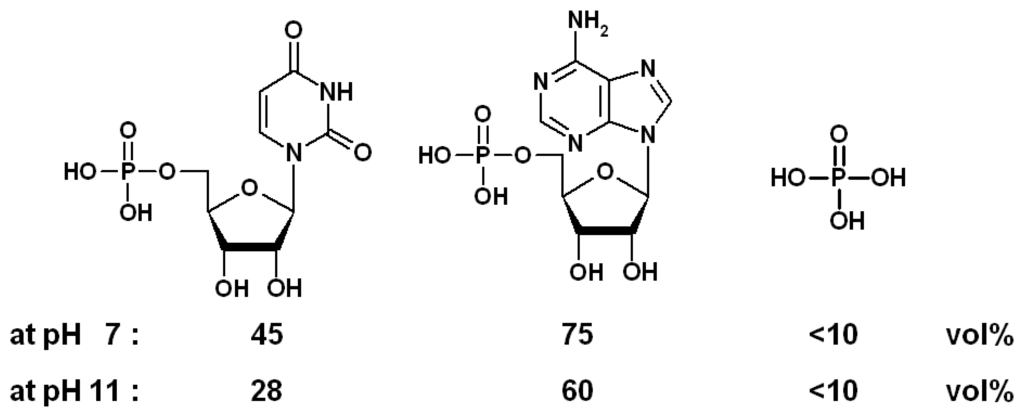 Expansions (in % volume) triggered by nucleotides UMP and AMP and phosphate (0.1 M) at different pH values; chemomechanical polymer I [].