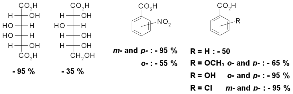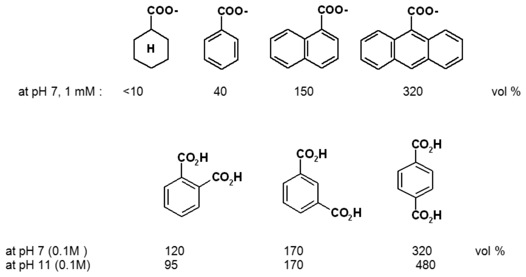 Relatively large differences in swelling promoted by various organic compounds have been observed with polymers such as I. They can be understood and planned on the basis of interaction mechanisms known from supramolecular chemistry. As indicated in Scheme 2, the ethylendiamine (ene) units allow not only metal chelation and pH-dependent protonation, but also hydrogen bonding as well as N+ cation-π effects. That the latter play an essential role is clear from the large chemomechanical effects observed only when aryl units are present in the effector molecule: the saturated cyclohexane-carboxylate has, within error, no effect in contrast to the nearly isosteric benzoic acid (Scheme 8) []. That electrostatic attraction, or ion pairing with the cationic N+ sites in I is an additional prerequisite for any size changes of the gel is evidenced by the inactivity of electroneutral compounds. Finally, the alkyl groups introduced into polymer I provide for lipophilic interactions, which vary among the different organic moieties of the effectors. In consequence, not only nucleotides (see Scheme 7) but even structural isomers such as different benzene dicarboxylicacids can be distinguished (Scheme 8).
