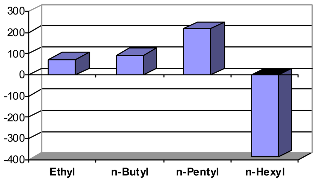 Dimension changes (volume, in [%]) with peralkylammonium hydroxides R4NOH (after correction for pH-induced change, pH 12.4 to 12.7). Schneider, H. J.; Liu, T. J.; Lomadze, N. Dimension changes in a chemomechanical polymer containing ethylenediamine and alkyl functions as selective recognition units. Copyright Wiley-VCH Verlag GmbH & Co. [].