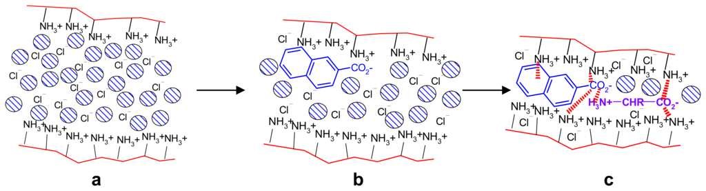 Selectivity can also seen in the combined effect of two substrates A and B such as e.g. naphthoic acid A and phenylalanine B, which both lead to contraction of polyethylenimine (PEI) gels. The simultaneous action of A and B exceeds that of A and B alone by 21 %. The results can be explained first by the replacement of the originally present chloride anions by either A or B, which is supported by cation-π interactions with the aromatic residues of A or B and the cationic polymer backbone []. The N-terminus of the aminoacid can furthermore form salt bridges with the A-carboxylate residue, thus stabilizing the incorporation of both effectors within the gel (Scheme 11). Other effectors such as benzoic or aliphatic acids do not show such positive cooperativity.