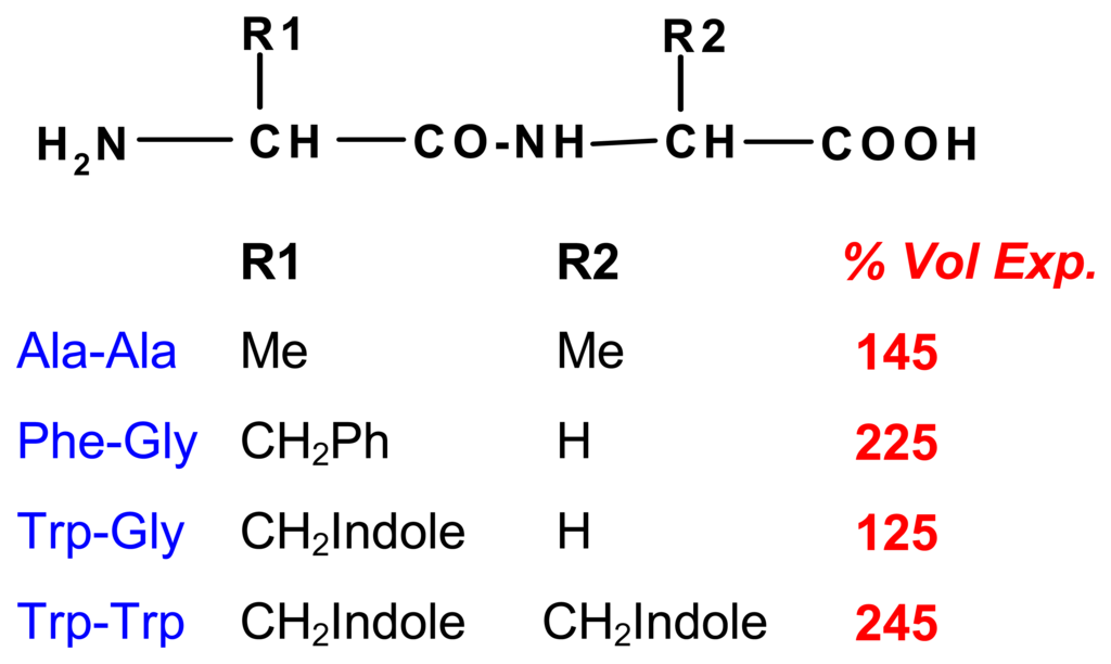 Volume expansions [%] on chitosan-anthrhyl polymer with different aminoacid esters; pH and salt effects deducted; (pH 5.0; 0.1 M effector) [].