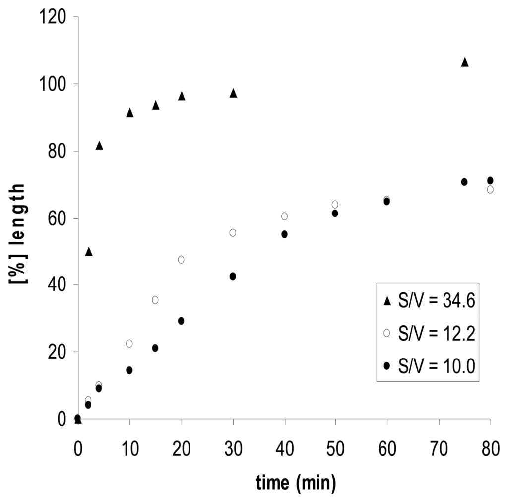 Expansion kinetics, and surface to volume S/V effects of chitosan II; elongation induced by 50 mM l-histidine and 0.1 M acetic acid, in 30mM phosphate buffer at pH 5.0. Approximate “half-life” time t1/2 for 50% of the maximum expansion: t1/2 = 42, 32 and 3 min for S/V = 10.0, 12.2 and 34.6, respectively [].