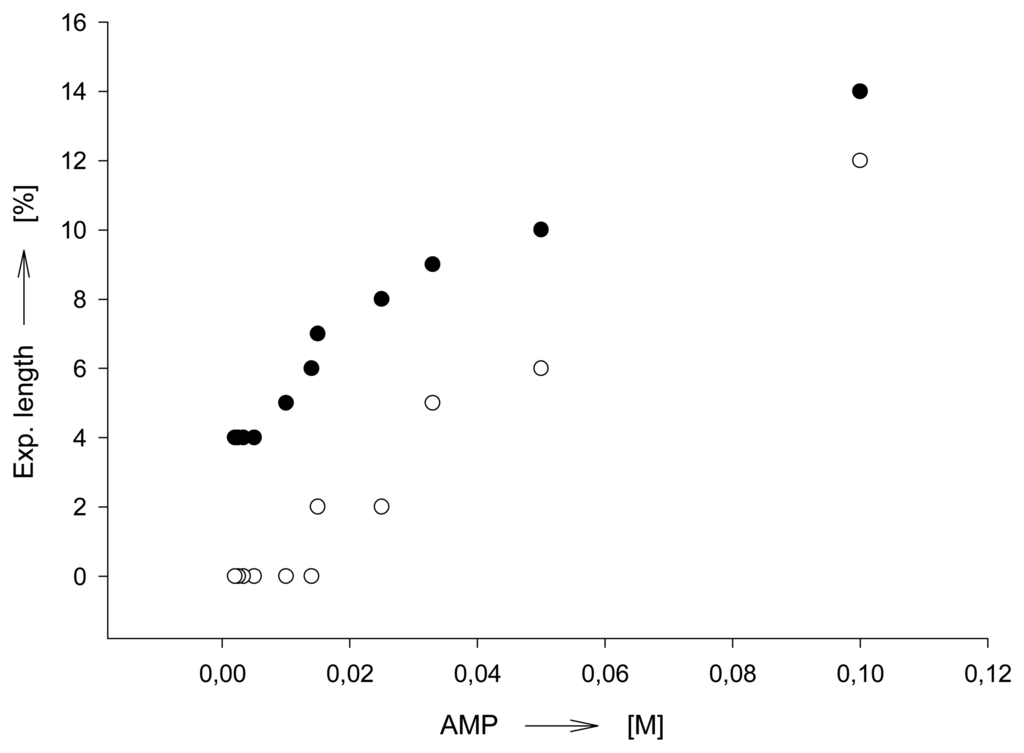 Expansion (length) as function of AMP concentration; polymer I, film size 5.0×2.0×0.4 mm, pH 7.0. Lower trace (○), in absence of buffer; upper trace (●), in presence of 0.02 M NaH2PO4 buffer. Schneider, H. J.; Liu, T. J.; Lomadze, N. Dimension changes in a chemomechanical polymer containing ethylenediamine and alkyl functions as selective recognition units. Eur. J. Org. Chem. 2006. 677-692. Copyright Wiley-VCH Verlag GmbH & Co. [].