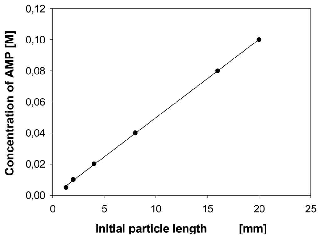 Effector AMP concentration needed for a certain expansion (here 35 % in volume) of polymer I as a function of the polymer particle size (variable length, with constant width and thickness; in 0.02 M phosphate buffer, pH = 7.0).Volume expansions of up to 300 % are possible under the working conditions with the smaller particles.