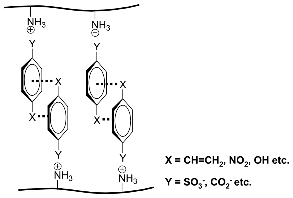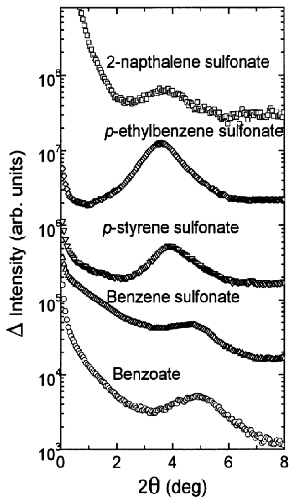 Using small angle X-ray scattering (SAXS, Figure 6) it has been shown that incorporation of strongly bound salts such as arylsulfonates leads to ordered structures, with distances between the polymer backbone which increase with the size of the guest molecules []. Such effectors lead to weight decreases of 95%; re-swelling is possible by treatment with excess of weaker effectors such as NaCl which cause only a 40% weight loss.