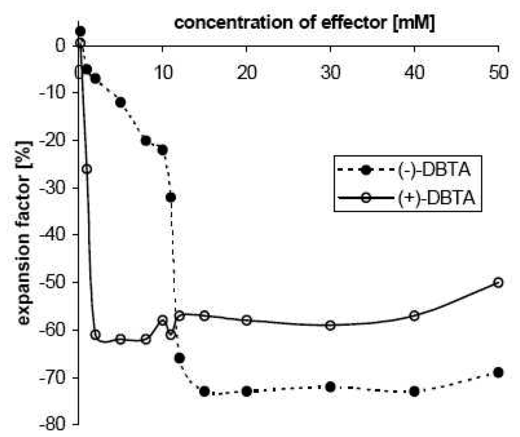 Size changes triggered selectively by enantiomeric effectors pose one the most interesting projects as it would allow, for the first time, the translation of chiral recognition directly to the outside world. In principle this can be achieved by the presence of optically active components within a chemo-mechanical polymer. Until now only the influence of chiral effector compounds or constituents on gelation, on the structure of gel materials [], and on phase or sol-gel transitions [] has been investigated. The gel derived from natural chitosan contains relatively well-ordered chiral aminoglucose units and is suitable for such applications []. In the case of histidine one observes a moderate, yet promising enantioselective difference in swelling, depending on the acid anion with which it is competing, with preference for the D-enantiomer over the L-form. The differences are 145 % vs. 120 % in the presence of acetate; to 134 % vs. 123 % in the presence of benzoate, whereas no difference was observed in the presence of chloride []. Much larger enantioselectivity is attained with optically active effectors containing several aromatic residues such as dibenzoyltartraric acids (DBTA). In the presence of acetic acid as a cofactor one enantiomer triggers up to a 95 % volume decrease of the chitosan gel, whereas the optical antipode leads to less than a 20 % change, depending on effector concentration (Figure 8).