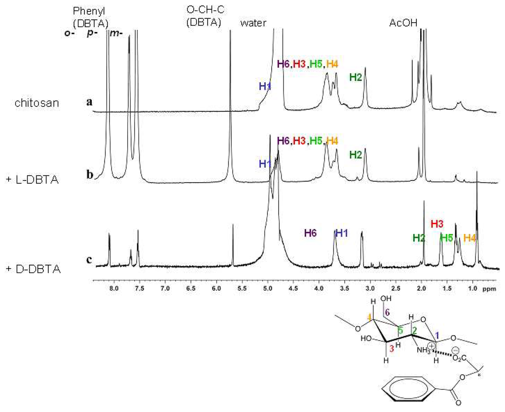 Solid-state 1H CP/MAS NMR spectra of chitosan gels II in the presence of AcOH cofactor, with structure model including signal numbering. (a) The swollen gel itself, (b) the gel treated with 5 mM of (–)-L-DBTA and (c) the gel treated with 5 mM of (+)-D-DBTA. Copyright Wiley-VCH Verlag GmbH & Co. [].