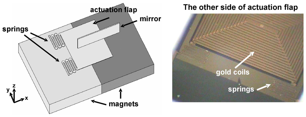 Fig. 1. A flap is connected to substrate by two springs. The metal coils are patterned in back of a flap. Two permanent magnets with opposite polarity in z direction are placed underneath the flap. The magnetic flux comes from the north-pole and enters the south-pole. Because the flap is placed between boundaries of two magnets and is close to the magnet surface, the magnetic flux passing through the metal coil is quasi-uniform in x direction. When current flows through metal coils, an upward magnetic dipole,