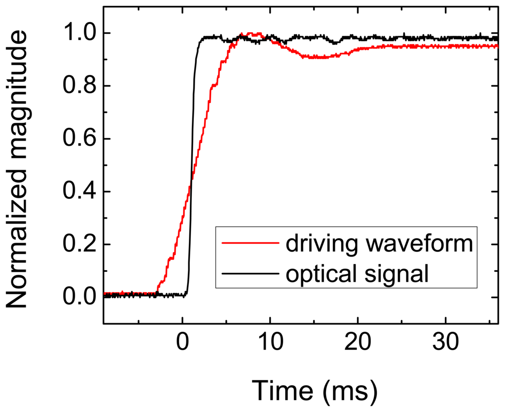 Fig. 10. The switching is measured based on Telcordia standard. It is measures from the initial application of driving waveform to the time which takes the optical signal to 90% of the steady state optical power level. Compared with