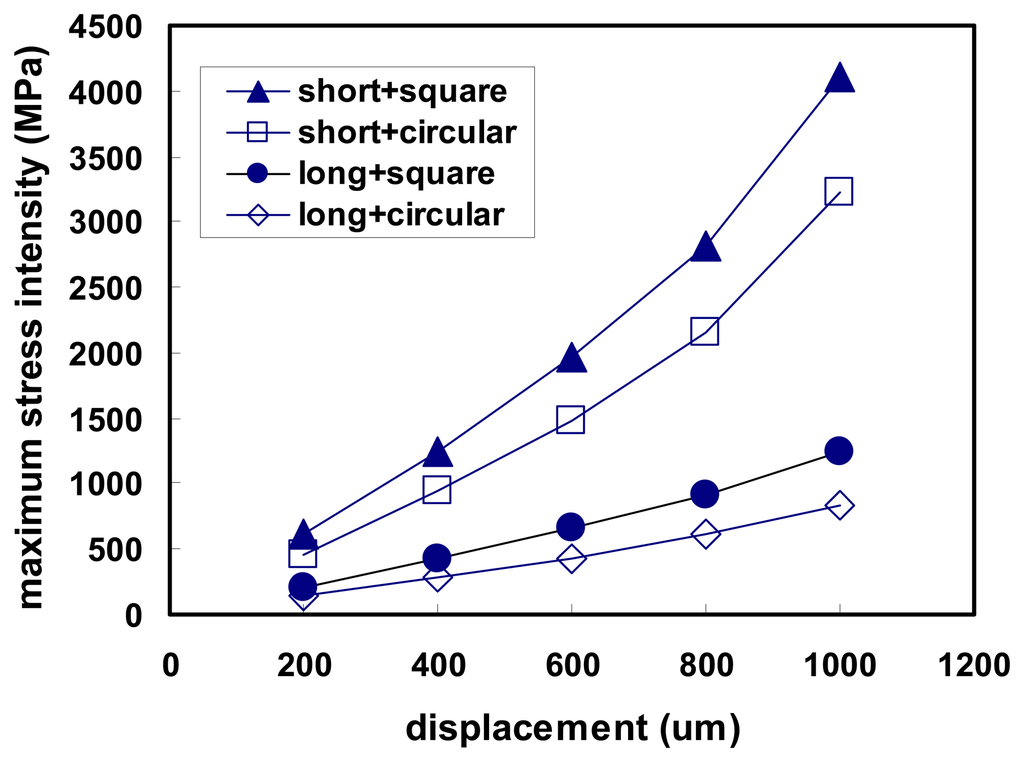 6]. We used circular shape and 50 μm width corner instead of square one. The maximum stress intensity is reduced to 451 MPa and 136 MPa for a short and long string as shown in