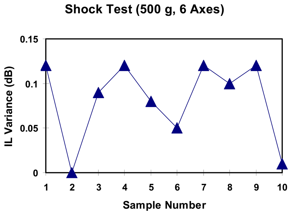 In the mechanical shock, the test was performed in three mutually perpendicular axes, two directions in each axis and five times per direction. There were a total of 30 shocks for each optical switch. The amplitude of mechanical shock (impact) is 500 g with one milli-second duration. In order to attain meaningful statistic data, there were ten samples subjected to the shock test to evaluate the redesigned serpentine springs. The results are shown in