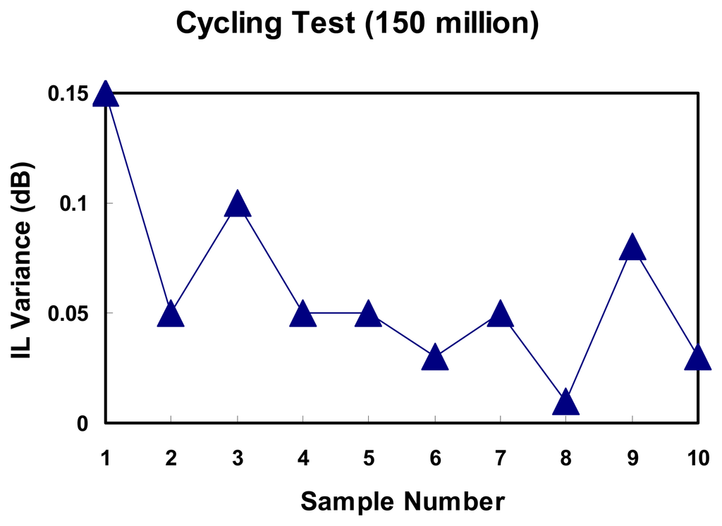 Finally, we performed a long-term cycling test on packaged switches. With reshaped driving waveform, we can minimize the overshoot of MEMS actuators so that the stress on the springs can be minimized. We have operated ten switches over 150 million cycles and all ten switches passed without any failure, as shown in