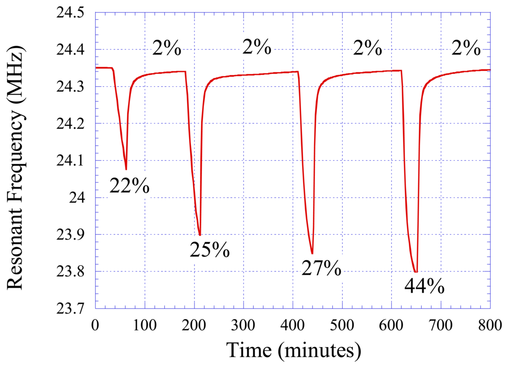 Fig. 10 depicts the change of the sensor's resonant frequency as a function of relative humidity level at 24 °C. As illustrated in the figure, the resonant frequency decreased from 24.35 MHz to 23.8 MHz from 2 % RH to 44 % RH. The reversibility of the sensor is illustrated in Fig. 10. As shown in the figure, the sensor was completely reversible between the dry and wet cycles. The response time from wet-to-dry cycle of 3 hours was longer than that of dry-to-wet cycle of 1 hour. This can be explained by the fact that it took longer time for water vapor to evaporate than to absorb on a surface.